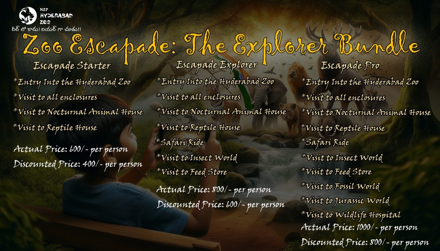 2. Escapade Explorer Package: It accommodates 100 students. Package includes entry into the zoo, a visit to all enclosures, reptile and nocturnal house visit, safari ride, visit to insect world, and the feed store.